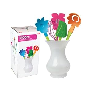 Brighten your kitchen with this bouquet of utensils. Set includes a Purple Tulip Whisk, Orange Flower Slotted Spoon, Blue Flower Solid Spoon, Green Leaf Spatula, Pink Pansy Slotted Turner and a White Vase. Each utensil head is crafted from heat resistant nylon, stainless steel, or silicone in bright, bold colors and green handles. White plastic vase stores utensils neatly on the counter.