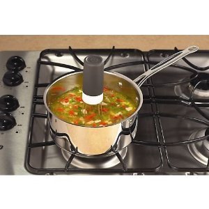 But it doesn't work like that. They buzz and hop around, and fortunately, I tested it in cool water away from the cooktop first. Because it would have splashed hot liquid all over the place, and then it fell over, into the "food" (which the instructions say, you should then throw the food away, due to concerns of contamination from the batteries, lead solder or whatever electronic waste is all up in there.
